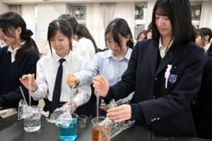 あさってから中間テストが始まります。高2美術デザインコースの科学と人間生活の、今回のテスト範囲は、主に「繊維」!ということで、テスト前に染色の実験を行いました。