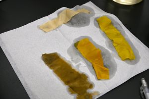 木綿の布を、玉ねぎの皮の粉末を使って染めるのですが、玉ねぎの皮溶液で煮出したしたあとに、金属イオンの溶液につけると、ただ玉ねぎ溶液で煮出しただけのときよりも鮮やかに発色します。