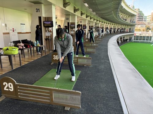 嬉しいことに定員以上の応募があり、くじ引きをして当選した生徒と学校の近所にある「スイング碑文谷」に行きました。人生で初めてクラブを握る生徒たちでしたが、指導いただいた田崎プロが丁寧に握り方から指導してくれました。