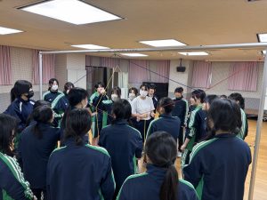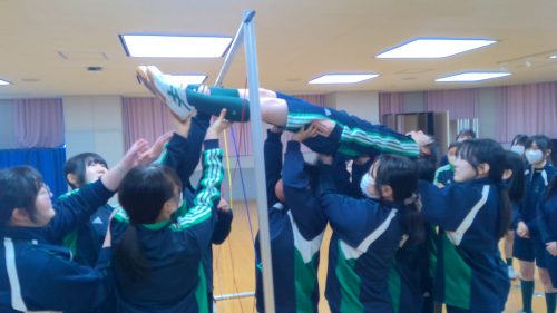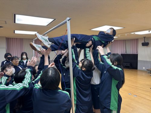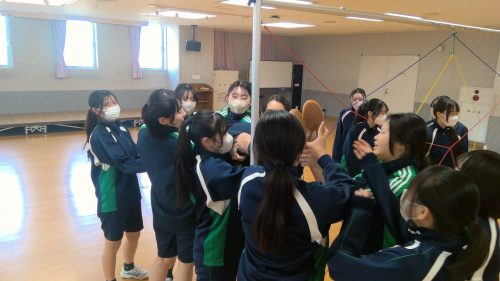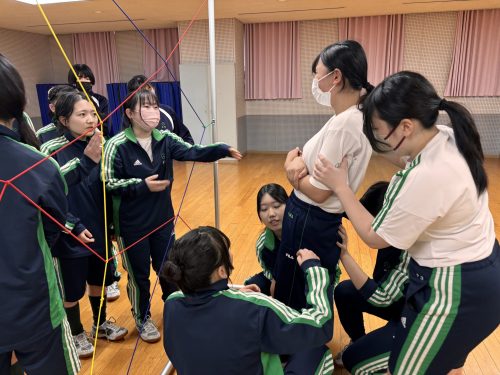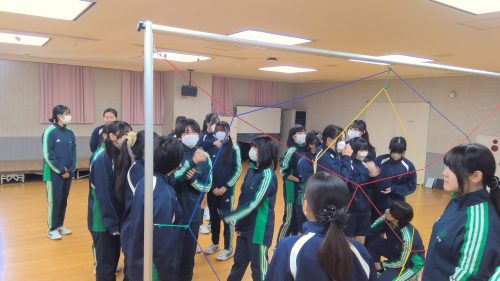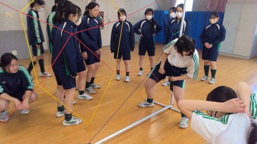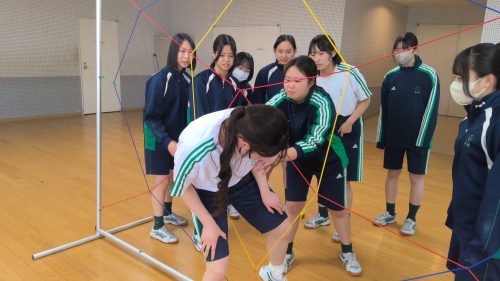 その名も「スパイダー」!すべての網の目に、ヒモに身体が触れないように人を通さなければなりません。誰が通るか、誰が支えるか、どの網の目から行くか。皆で話し合いながら最善策を探し、実践していきます。失敗したら振り返り。成功したら全員で喜ぶ。PA醍醐味の問題解決学習、協働学習が生かされる瞬間です。高校生活最後の体育の授業を、みな笑顔で終えることができました!
