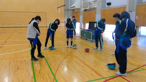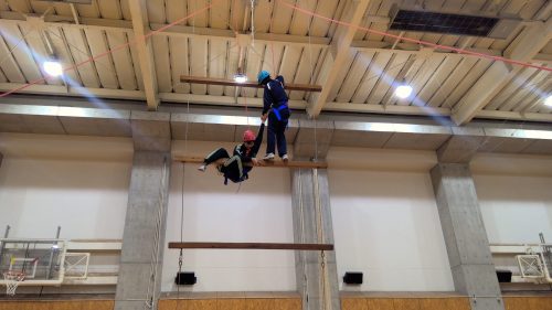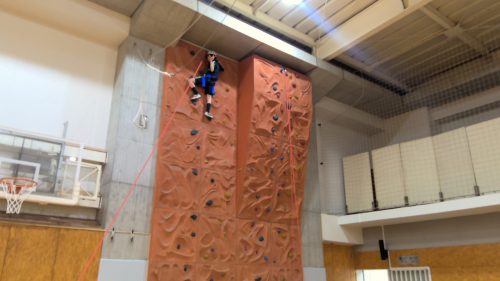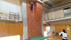 受講したきっかけは、「高いところが好き!」「高1のハイエレメントで考えながらやるのが楽しかった」「この先の人生でやることはないし、こんな専用の施設がある体育館はないから」「高1の時にクライミングウォールで一番上までたどり着かなかったからもう一度やりたい。今度こそ一番上まで行く!」とのこと。