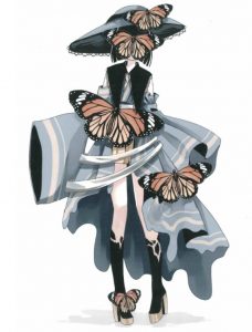 2025のテーマは『憧れのあの人に着せたい服』だそうです。「いつも堂々としていて明るい友人に着て欲しい服をデザインしました。友人は和服が好きなので、着物の要素も取り入れつつ、いつも自由でいる友人のイメージから蝶をモチーフにしました」とのこと。