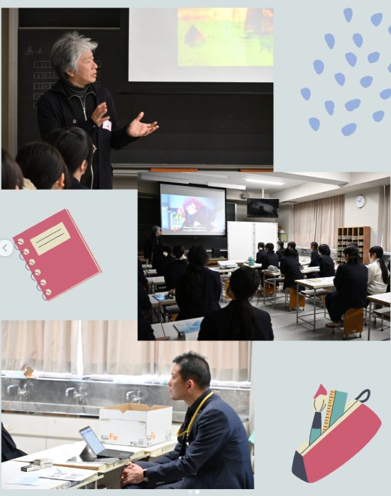 授業では、錯視効果やアニメーションの歴史、さらには現代のアニメや2.5次元、アートアニメーションに至るまで、多岐にわたる内容を幅広くご講義いただきました。生徒たちは皆、熱心に耳を傾けており、非常に有意義なひとときとなりました。また、参観した田村校長も、生徒とともに楽しそうに聞き入っていました。