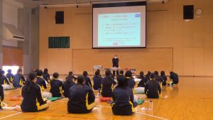 毎年、高校1年生では、保健の授業の一環として普通救命講習を全員に実施しています。東京防災救急協会や目黒消防署の方や目黒区の消防団の皆さんが来校してくださり、実習を交えながらAEDを用いた心肺蘇生を教えていただいています。